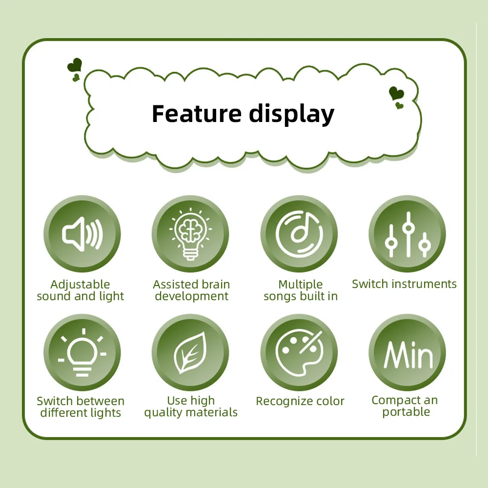Features: 【Adjustable Sound and Light】: This colorful electronic piano features adjustable sound and light settings, allowing you to customize your musical experience. It comes with multiple built-in songs, providing a variety of tunes for you to enjoy and learn. 【Multiple Instrument and Light Modes】: The piano allows you to switch between different instrument sounds and light modes. This feature adds a fun and interactive element to your music playing, making it more enjoyable and engaging. 【High-Quality and Portable】: Made of high-quality materials, this piano is designed to last. It's compact and portable, making it easy to carry around. Plus, its colorful design can help children learn about different colors while enjoying music. 【Volume/Light Brightness Adjustment Key】: The piano features a key for adjusting the volume and light brightness. A short press changes the volume level, with three levels to choose from. A long press changes the brightness level, also with three levels to choose from. 【Learning Mode and Auto-Demo Key】: The learning mode key allows you to learn how to play the piano with LED light guidance. The auto-demo key plays 13 songs with corresponding LED light flashes. The sound switch key changes the instrument sound of the 13 touch keys, with five instrument types to choose from. The light mode key changes the LED display mode of the 13 touch keys, with three modes to choose from.