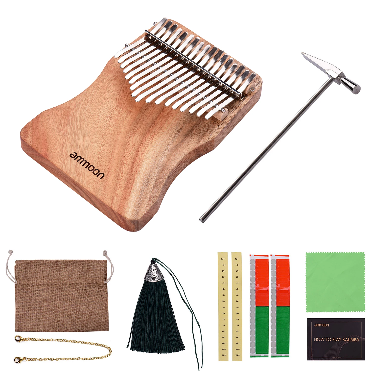 Package List: 1 * Thumb Piano 1 * Carry Bag 1 * Music Book 2 * Notes Sticks 2 * Scale Stickers 1 * Tuning Hammer 1 * accompaniment Chain 1 * Tassel Decorations 2 * Finger Protector