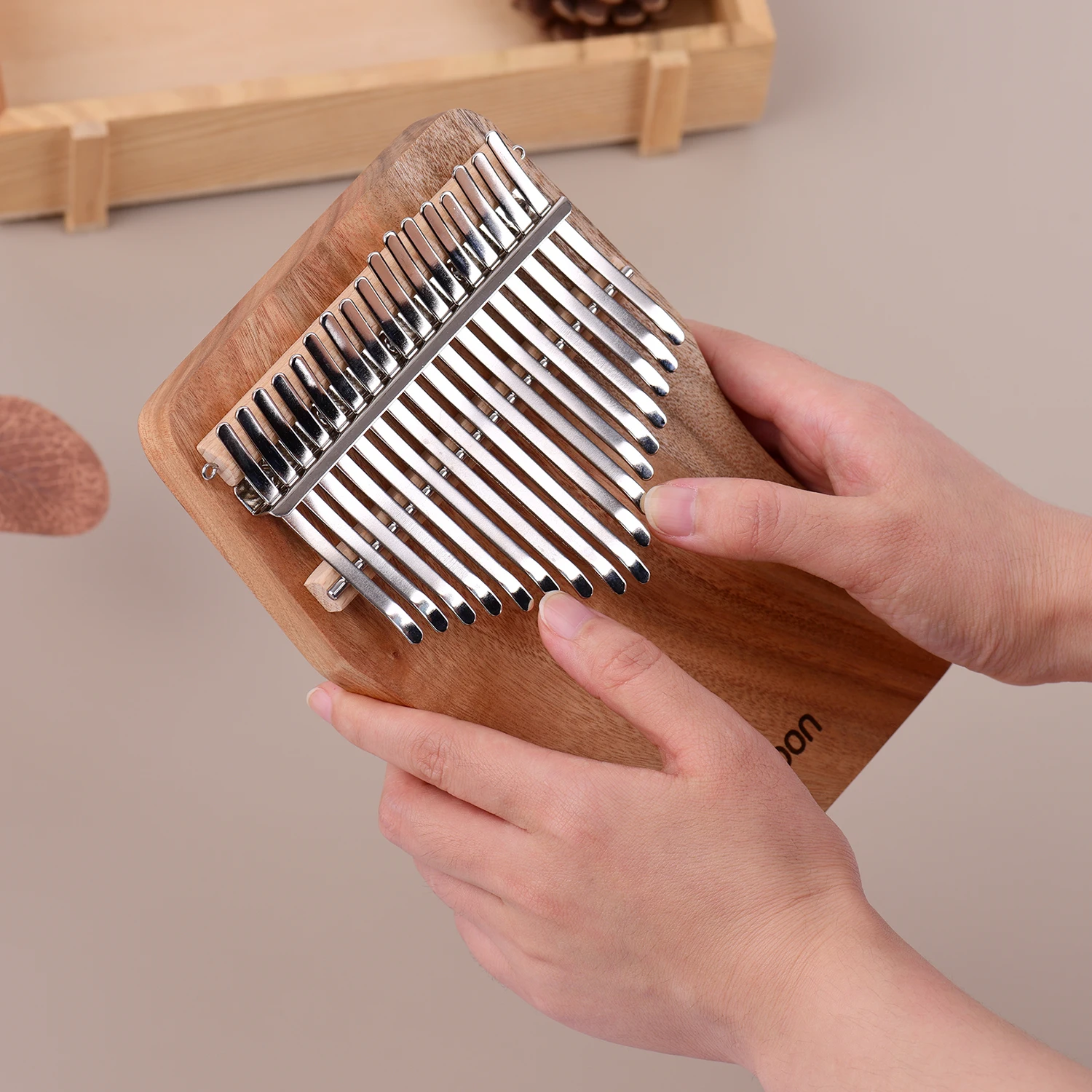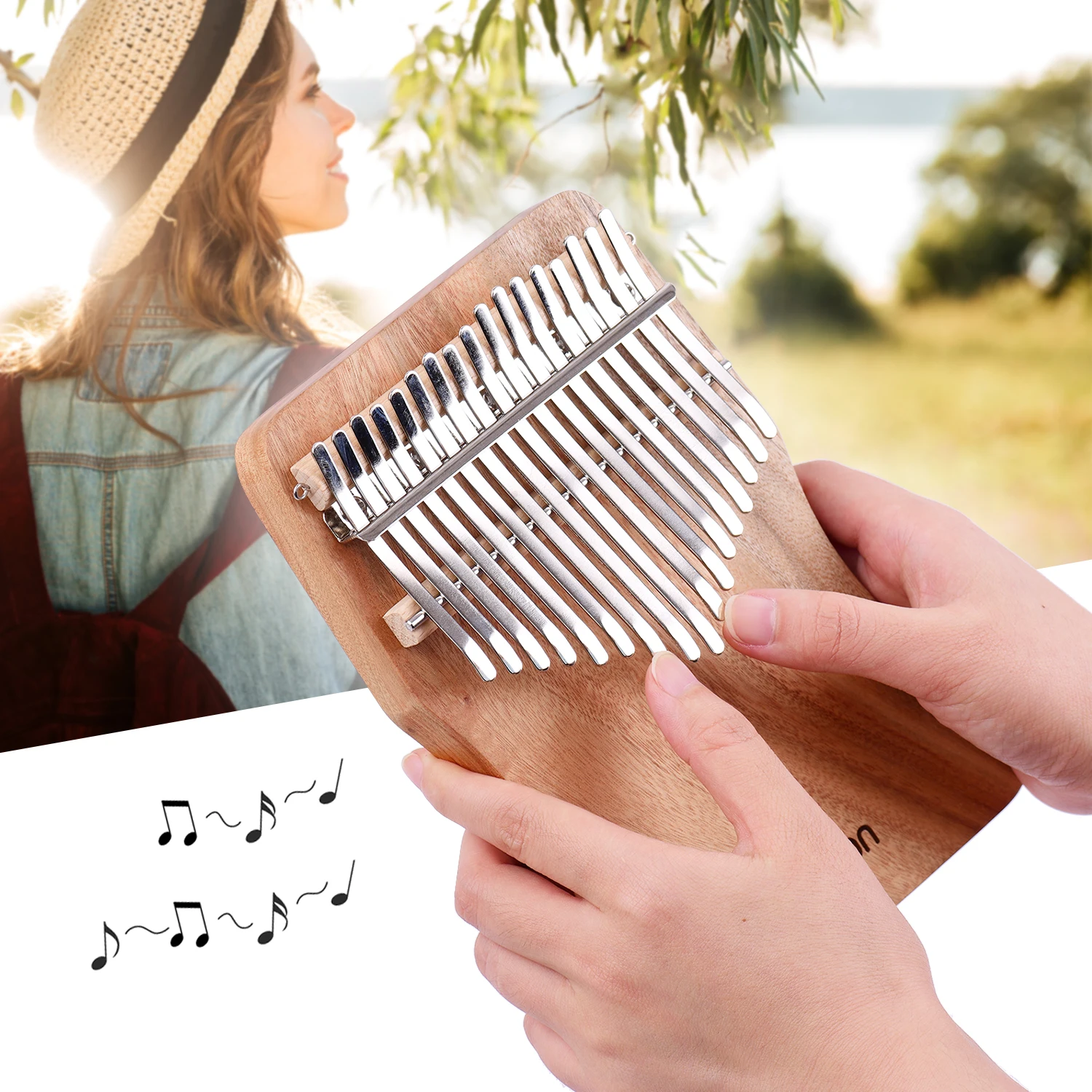 Features: 【Solid Wood Material】Special slim waist shaped design, camphorwood material with a special wood fragrance; 17pcs steel tines provides you with bright and clear timbre, and you can also create special tremolo with the accompaniment chain. 【International Standard C Tone】The corresponding tunes of the steel tines are 1(D6)/2(B5)/3(G5)/4(E5)/5(C5)/6(A4)/7(F4)/8(D4)/9(C4)/10(E4)/11(G4)/12(B4)/13(D5)/14(F5)/ 15(A5)/16(C6)/17(E6)(from left to right), you can play some simple songs. 【Easy Playing and Quick Learning】Just holding it in the hands and plucking the tines with your thumbs to create clear and melodious sounds; and comes with music book and stickers for quick learning and easy playing. 【Compact & Portable】Portable compact size, convenient to carry around, you can make wonderful music anywhere; suitable for travel entertainment, religious ceremonies, relax,decompression, weddings and other social gatherings. 【Various Practical Accessories】Comes with instruction music book, musical scale stickers, notes stickers, a tuning hammer, a carry bag, an accompaniment chain, a beautiful tassel decoration and 2pcs finger protectors.(Some items random color delivery)