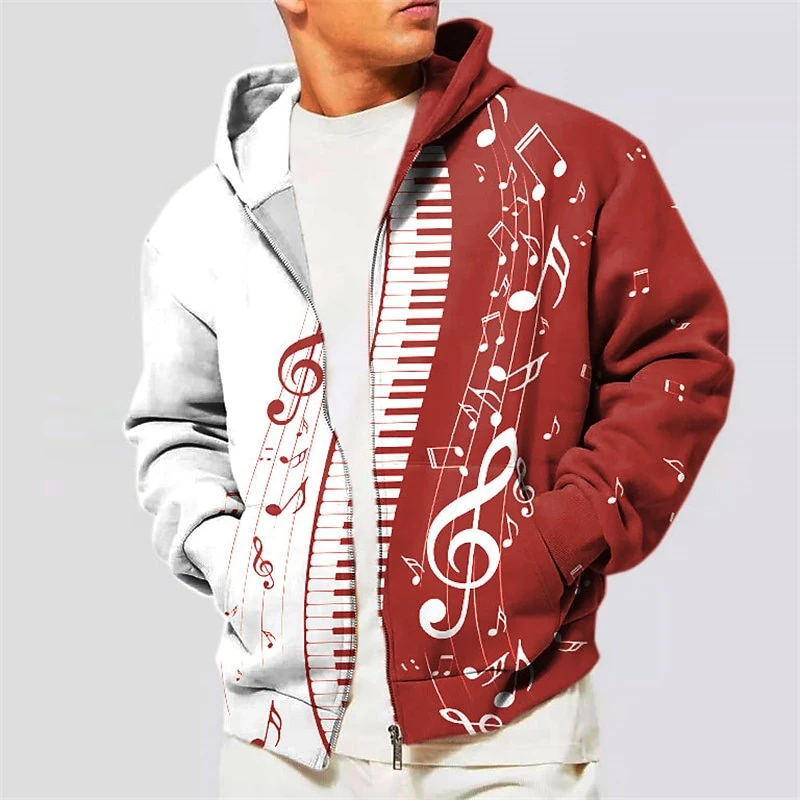 Casual Piano Keys Pattern Zipper Hoodie Fashion Trend 3D Musical Notes Printed Zip Up Hoodies Autumn Loose Harajuku Sweatshirt