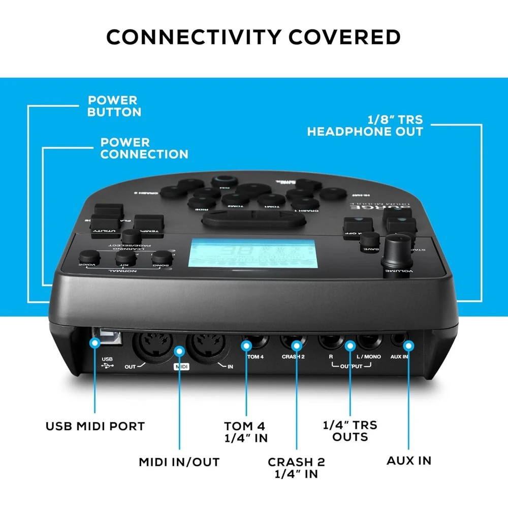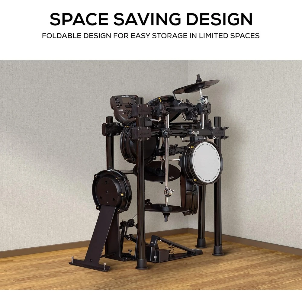 Everything You Need – A solid 4-post drum rack that is foldable for easy storage, a cable snake, drum sticks, drum key, kick pedal, a hi-hat control pedal, and power supply are all included