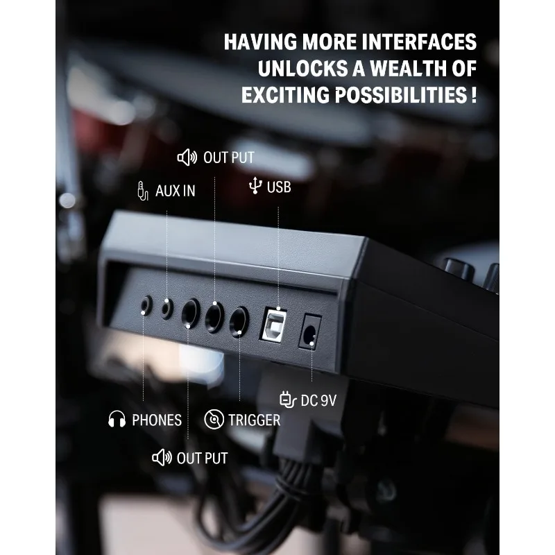 [Diverse Sounds Selection] With faithful real drum sampling, the electric drum kit offers 450 sounds and 31 classic and modern drum kits that are more than enough to deliver an exciting performance.