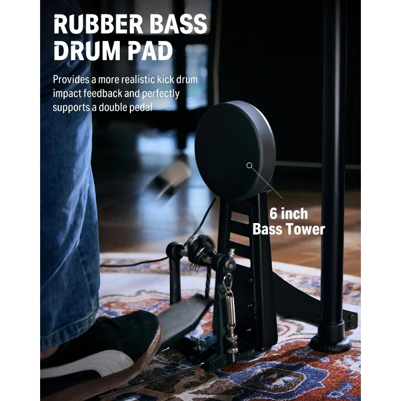 [Complete Accessories] Everything you need is included: a foldable iron metal stand with a stable and secure 4-post aluminum rack, hi-hat control, bass drum pedal, headphones, drum throne, audio cable, and drumsticks.