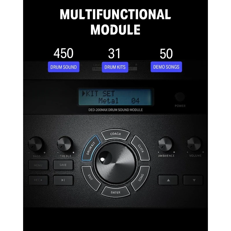 [Larger and More Precise] The DED-200 MAX upgrades from the DED-200 with 1 x 12” crash, 1 x 12” ride, 1 x 10” snare, 1 x 10” tom3, 1 x 10” hi-hat, providing larger and more precise hit detection points.