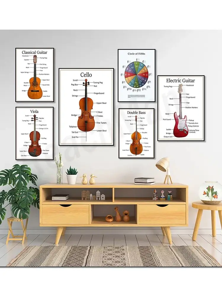 Percussion, brass, string instruments, circle of fifths, violin, symphony orchestra layout, notes and rests, music theory poster