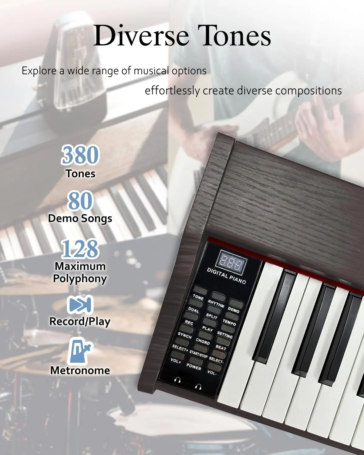 [Unleash Creativity & Versatility] Unlock your creative potential with a diverse range of integrated features. Explore an extensive palette of 380 tones, 128 rhythms, and 80 demo songs at your fingertips. Effortlessly manage functions like metronome, tempo, and transpose through the intuitive control panel. Empowering experimentation and dynamic creation, this piano keyboard adapts to your musical voyage, embracing versatility.